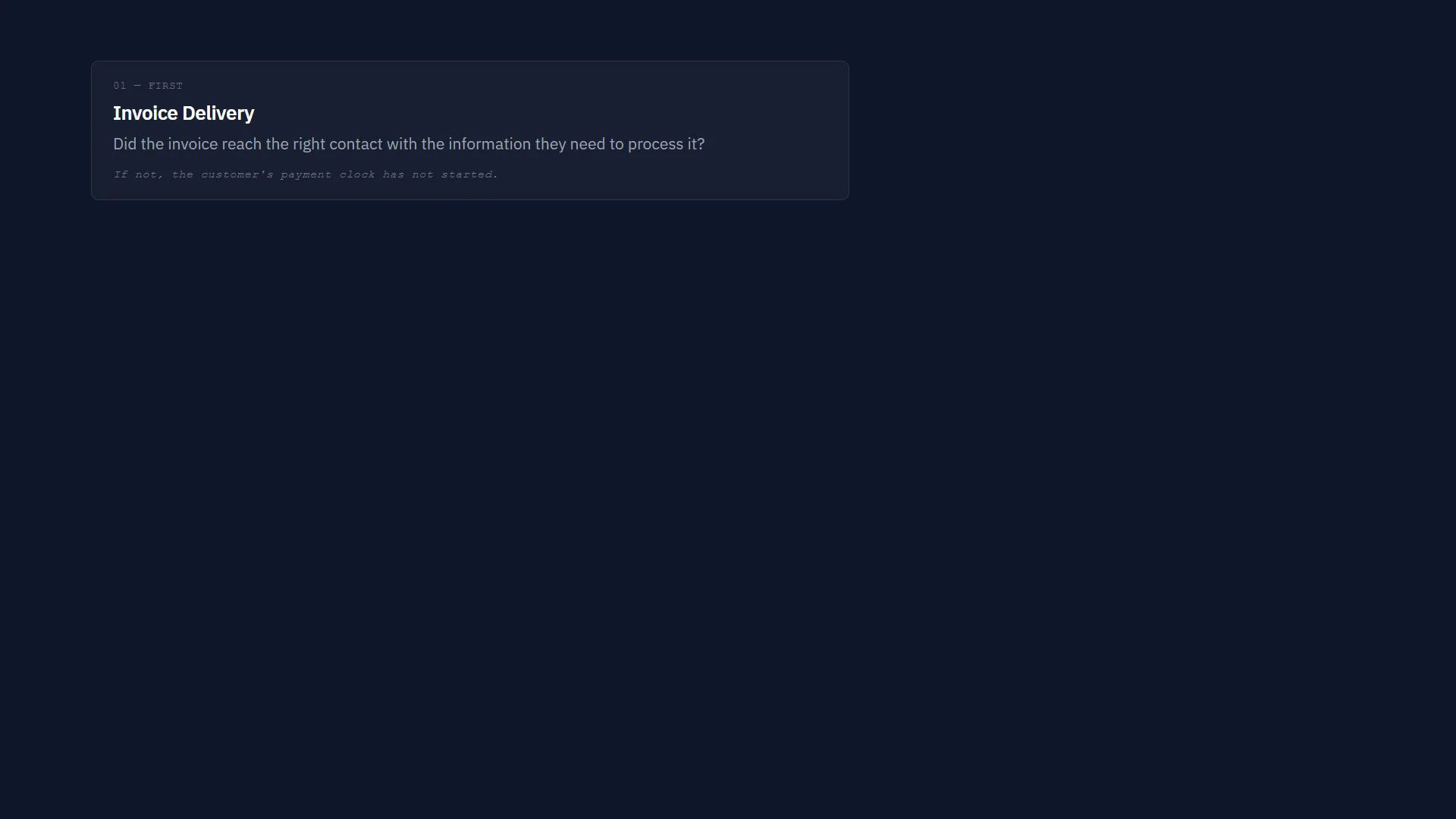 Whether the invoice reached the right contact, with the right supporting detail, and when. Gaps here create disputes before collections even starts. Most companies do not know they have a gap until the customer pushes back.